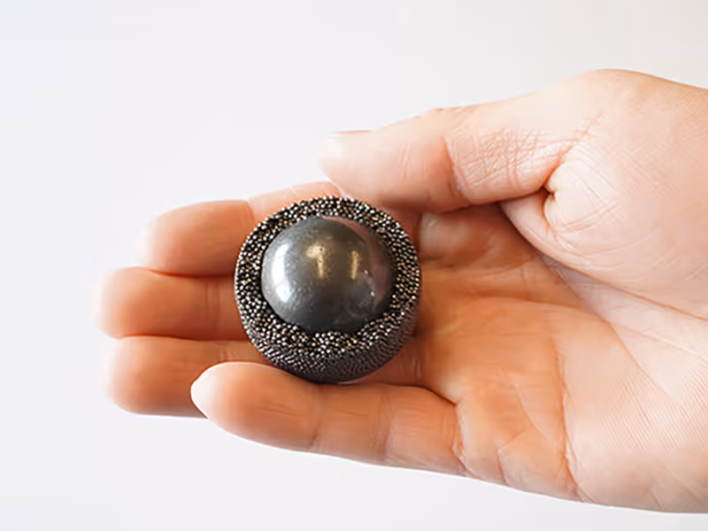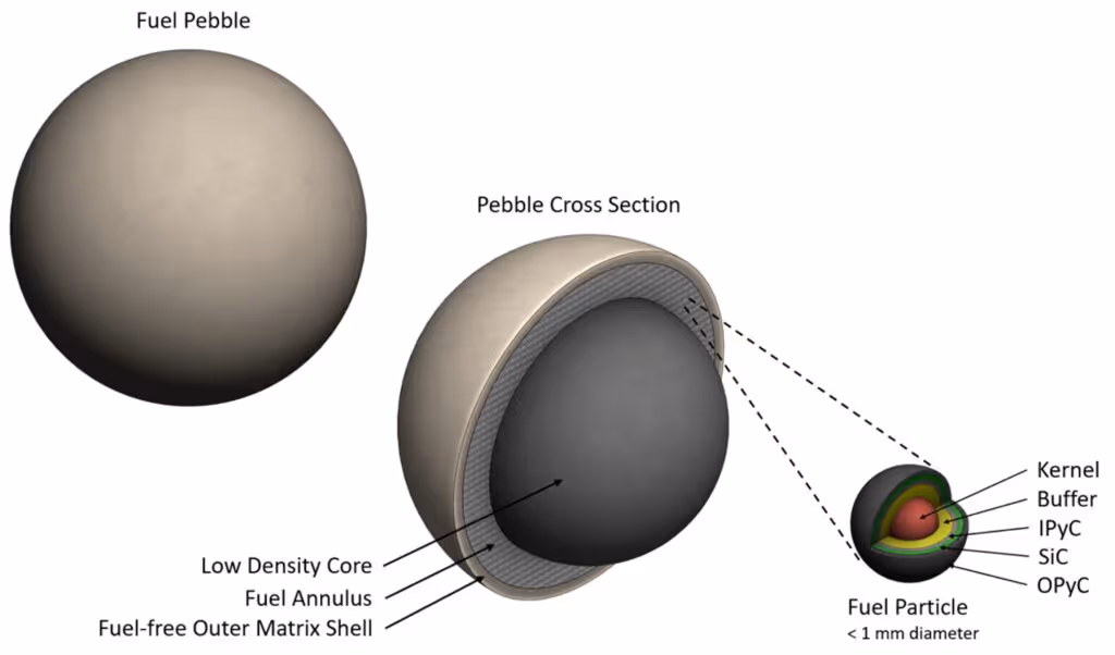 Kairos Power embeds TRISO particles into spherical graphite fuel pebbles similar to those used in high-temperature gas reactors but with some important differences. Our golf-ball-sized pebbles are smaller and feature a novel design optimized for KP-FHR, with a low-density graphite core surrounded by an annular fuel matrix.