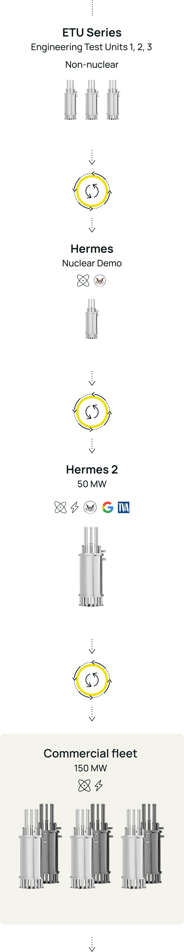 Together with our partners, Kairos Power will build on the learning from the Hermes series to develop, construct, and operate a commercial reactor fleet. We’ve committed to delivering up to 500 megawatts of carbon-free electricity to Google under a Master Plant Development Agreement. A new model for advanced nuclear deployment made possible by Kairos Power's iterative development model, which demonstrates KP-FHR's technical and market viability through methodical iteration and continuous learning.