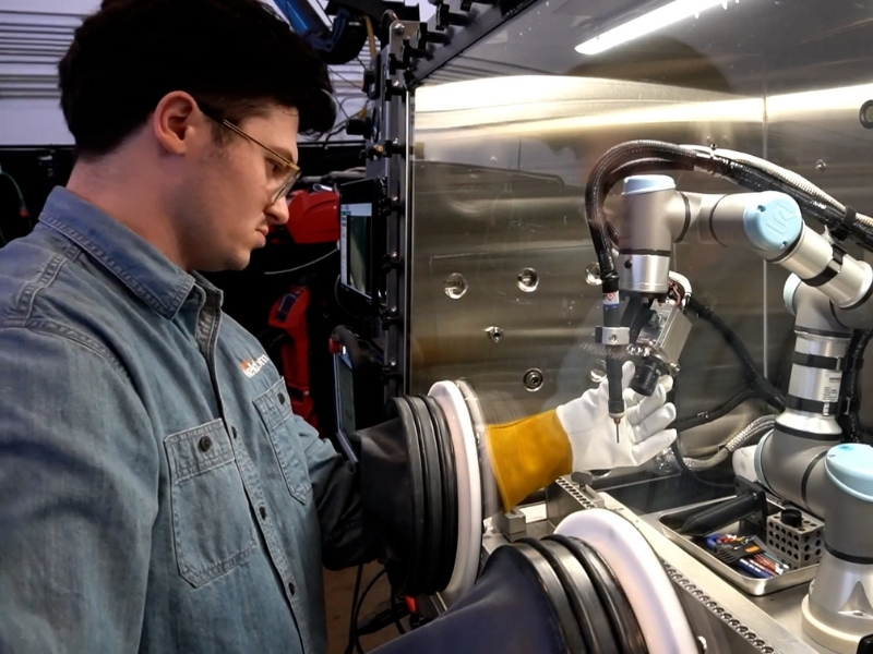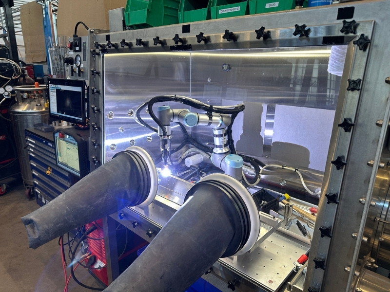 The end result was an automated welding solution that integrates a Gas Tungsten Arc Welding setup inside of an inert glovebox with a robotic arm to enable high-quality welds inside a controlled, oxygen-free environment.